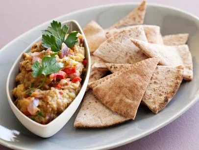 Preheat oven to 400 degrees. In a large bowl, toss eggplant with 1 Tbsp olive oil. Spread eggplant on a large baking sheet and roast in the oven for 15 minutes, turning every five minutes. Eggplant is done when it is tender and lightly browned. Remove from oven and let cool slightly. Transfer eggplant to a food processor and add remaining olive oil, salt and pepper, lemon juice, red peppers and garlic. Pulse mixture until ingredients are well-combined. You may also puree, if desired. Transfer dip to a serving bowl and stir in basil. Serve with baked pita chips, spread on whole grain bread or use as a dip for cut veggies.