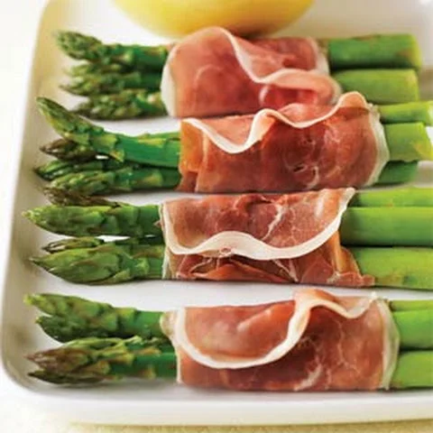 GRILLED ASPARAGUS WITH LEMON OLIVE OIL, PECORINO AND PROSCUITTO