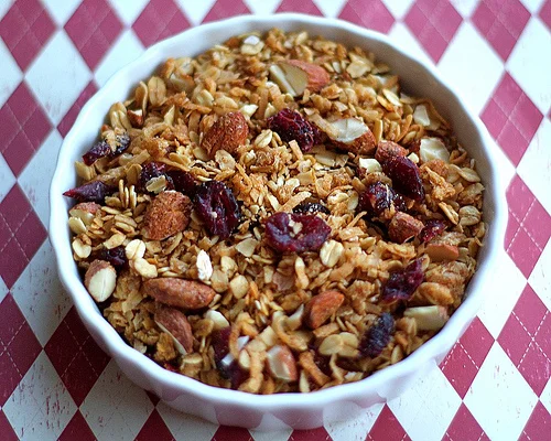 Preheat oven to 350°. Spray baking sheet with non-stick olive oil spray. Combine oats, almonds, cinnamon and coconut. In a separate bowl, combine oil, honey and vanilla. Pour over the dry mixture and mix until well coated. Spread on a baking sheet and bake for 12 to 14 minutes until golden, stirring half-way through. After the granola has cooled completely, stir in raisins and cranberries. Store in an airtight container.